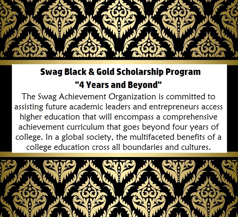 The Swag Achievements Organization is committed to preparing academic leaders for college, career and life. Our students are some of our most valuable asset. The Swag Black and Gold Scholarship Program aims to help assist selected students succeed in a globalized 21st century.